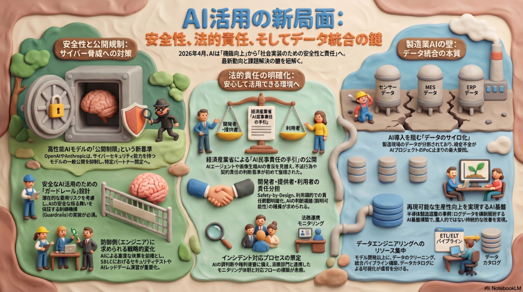 本日の自動収集パイプラインからのレポートでは、AIモデルの急速な能力向上に伴う「安全性と法的責任」の明確化、そして産業現場における「データ統合」の重要性が大きく取り上げられている。